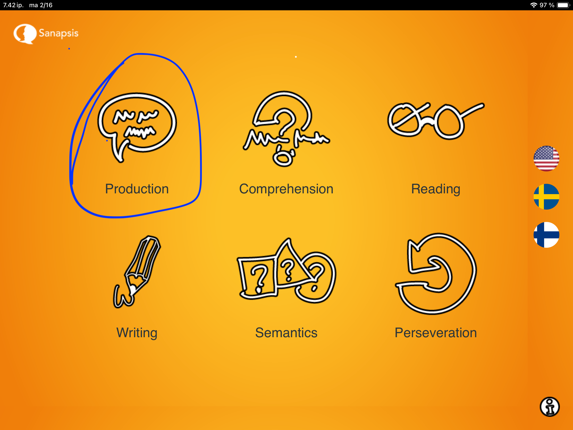 The Speech Production category includes exercises: