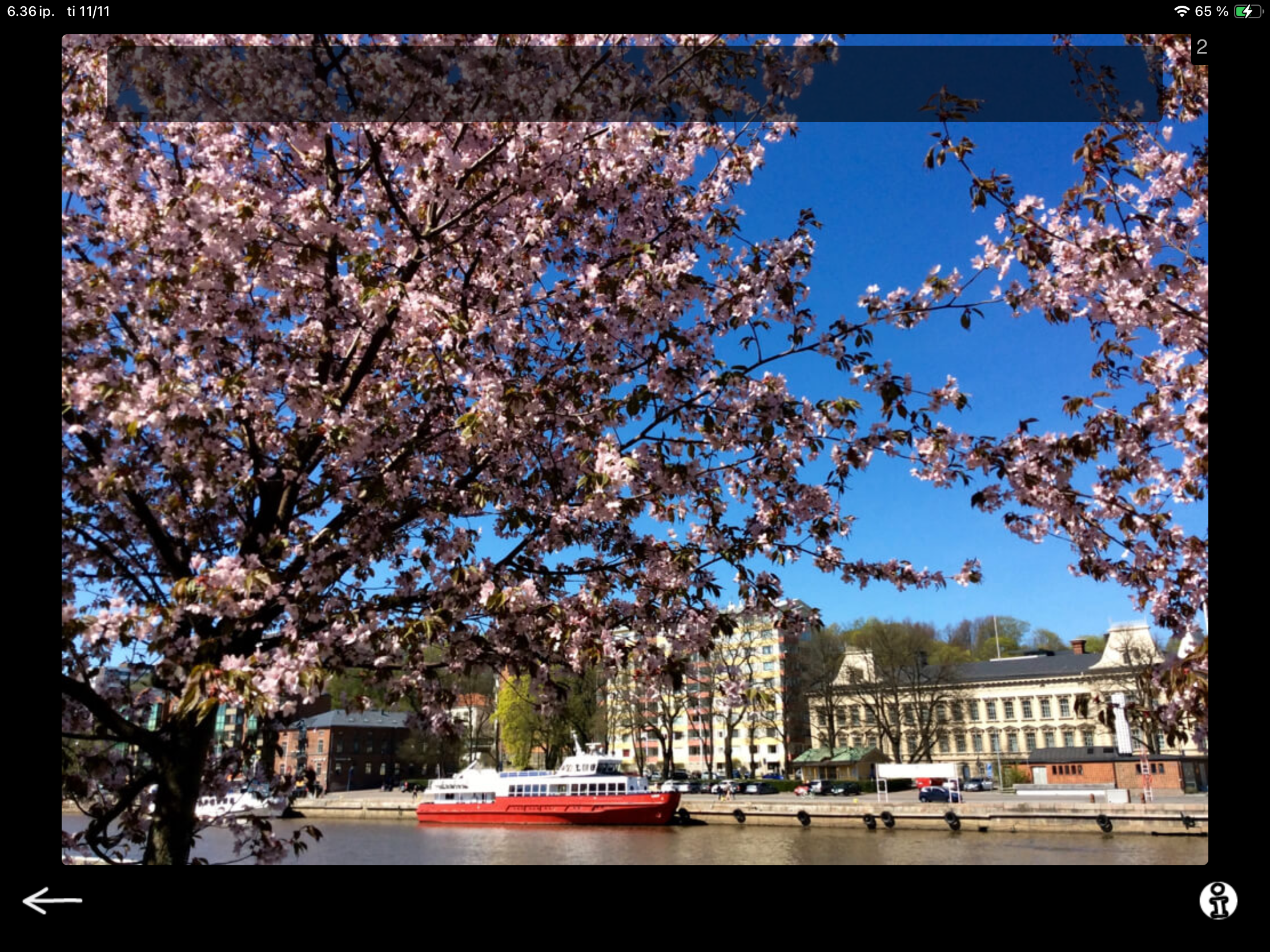 If I were to talk about this sample image freely, I might say: It looks like springtime in a city that has with a river running through it. There are big trees with pink flowers, and a red boat on the river. I don’t see any people walking, even though it looks like a lovely day. If I lived in that city, I think I’d enjoy a walk along the riverside on a day like that. Looks like it might be a bit cold though.